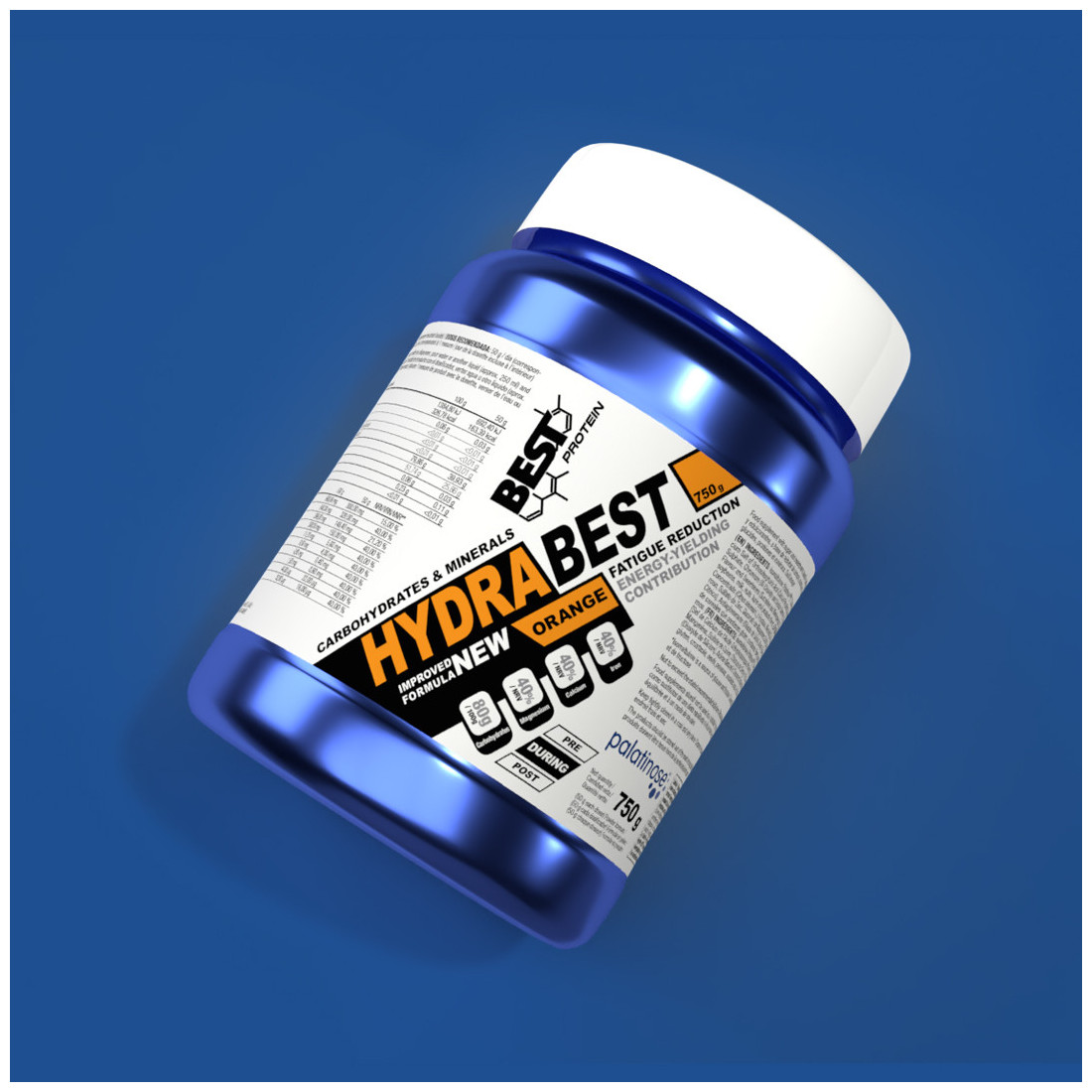 HYDRA BEST está compuesto de una mezcla de carbohidratos de rápida absorción como la isomaltulosa, la dextrosa y la maltodextrina (1) que suman casi 80g por cada 100g de producto. Este gran porcentaje de carbohidratos nos permite un gran aumento de energía intra-entrenamiento, retrasando la fatiga y mejorando el rendimiento (1).